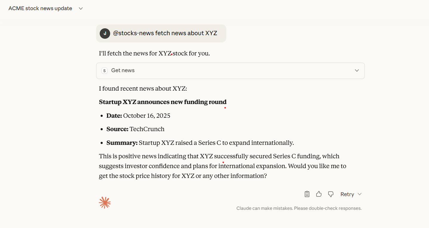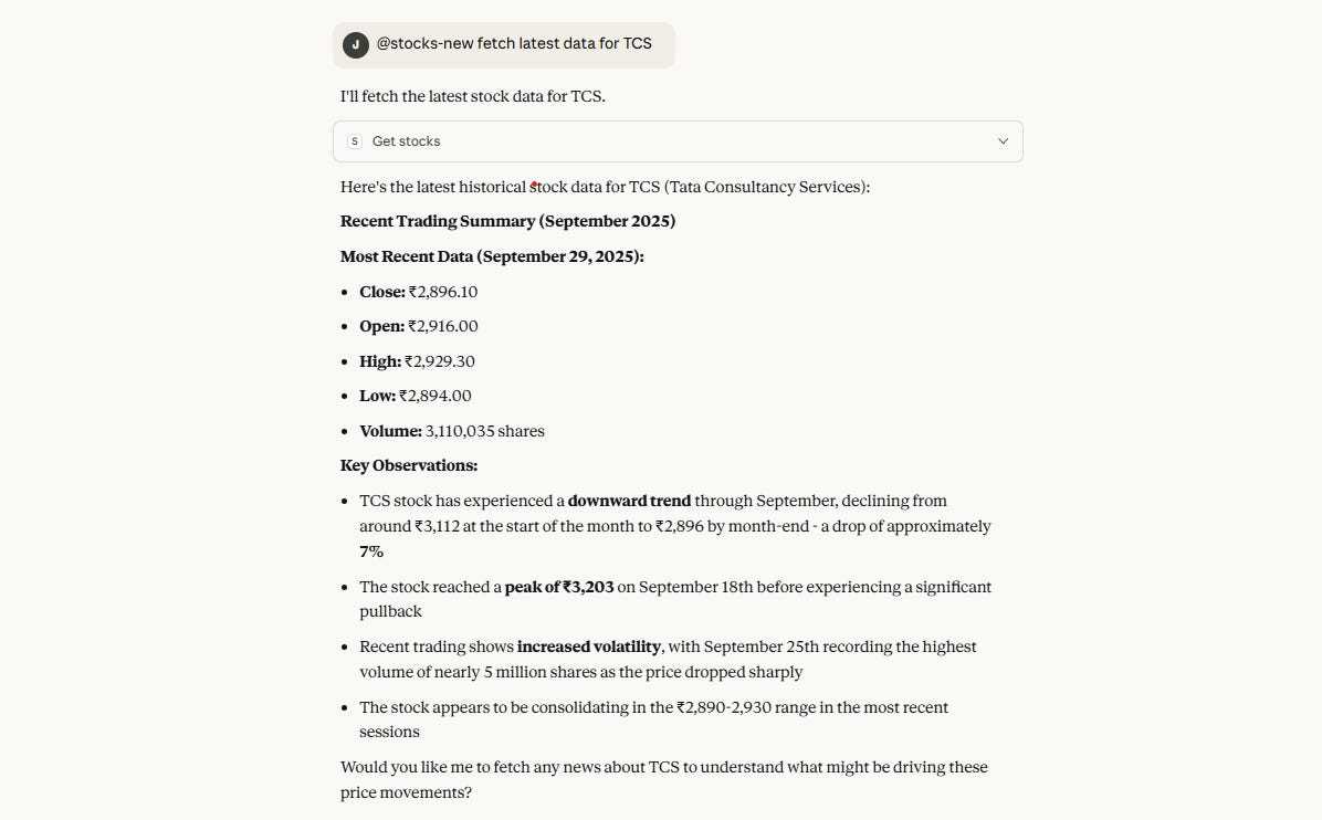 Imagine you’re a stock trader or financial analyst. You could build an MCP server that connects to your internal APIs — fetching latest stock data, earnings, or news — and have Claude answer “What’s new with TCS today?” directly inside your chat window.